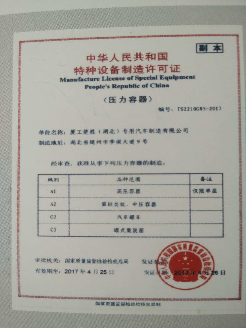 今天我們就以全國最大的油罐車生產(chǎn)企業(yè)之一廈工楚勝(湖北)專用汽車制造有限公司為例來說明一下油罐車生產(chǎn)企業(yè)的資質(zhì):