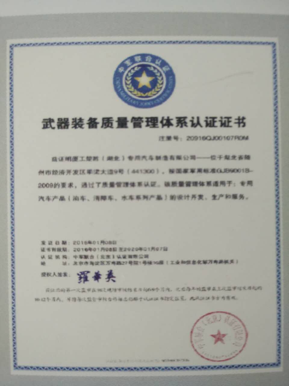 《武器裝備質(zhì)量管理體系認(rèn)證證書>