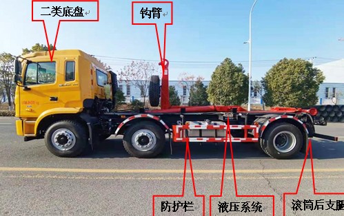 CLW5240ZXX6HH型車(chē)廂可卸式垃圾車(chē)是在二類(lèi)汽車(chē)底盤(pán)的基礎(chǔ)上,加上鉤臂、液壓系統(tǒng)、防護(hù)欄、連接附件等裝置組成,具體如下: